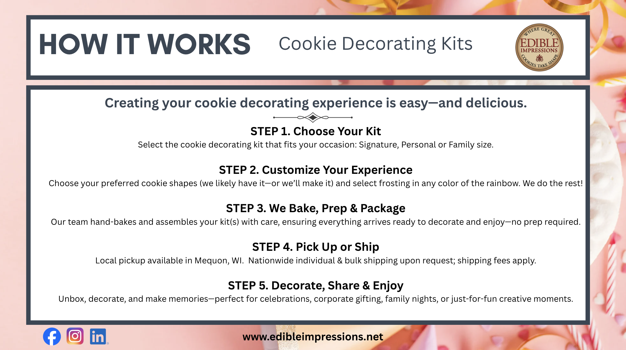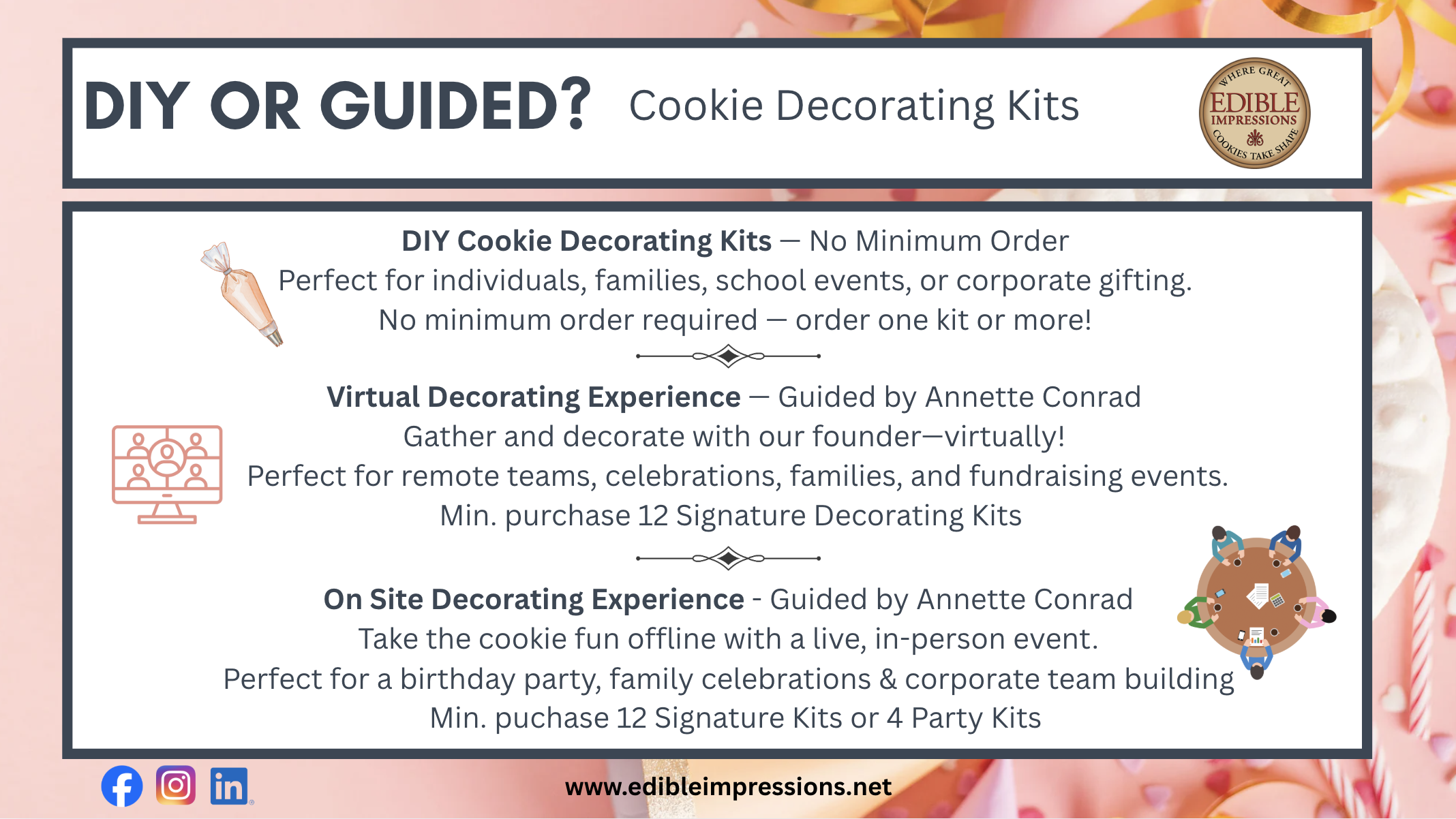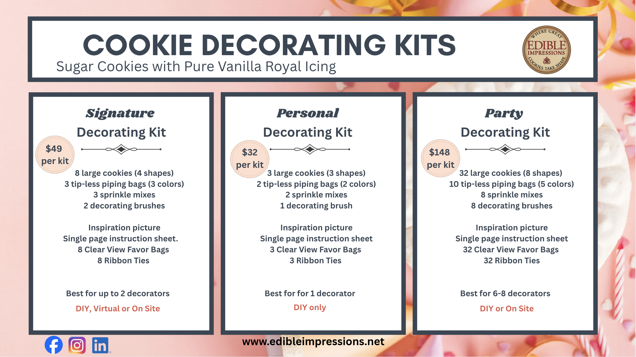 Our Cookie Decorating Kits start at $45 per kit and always include personalization and custom-branded packaging at no additional cost.